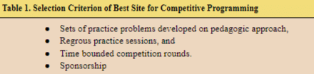 The criterion to select a site as best for competitive programming is given Table 1 below: