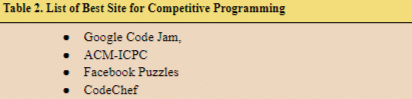 Based on criterion given in Table 1 following websites has been shortlisted and considered best for Competitive Programming, Table 2 gives list of Best site for Competitive Programming: